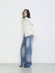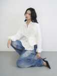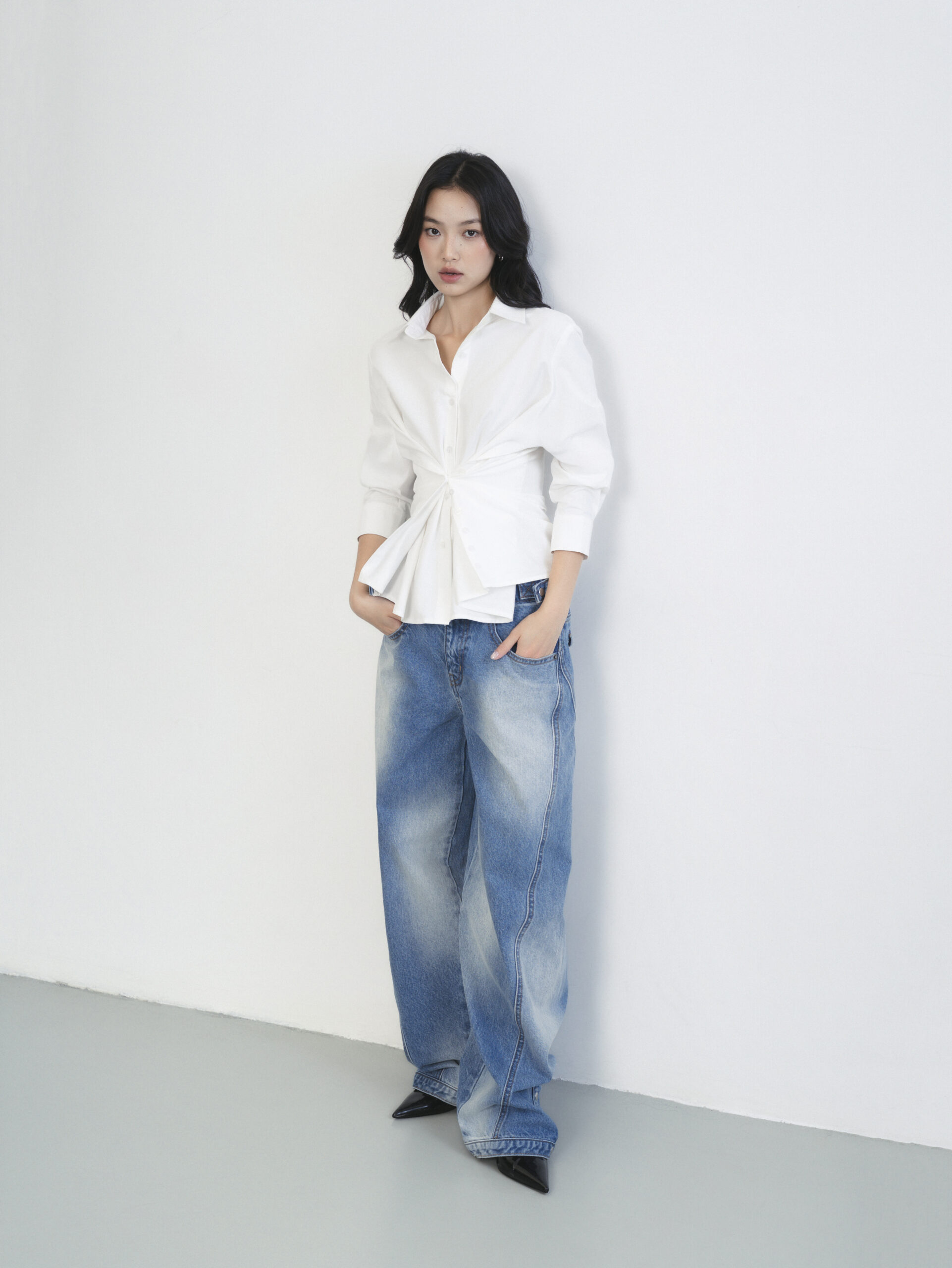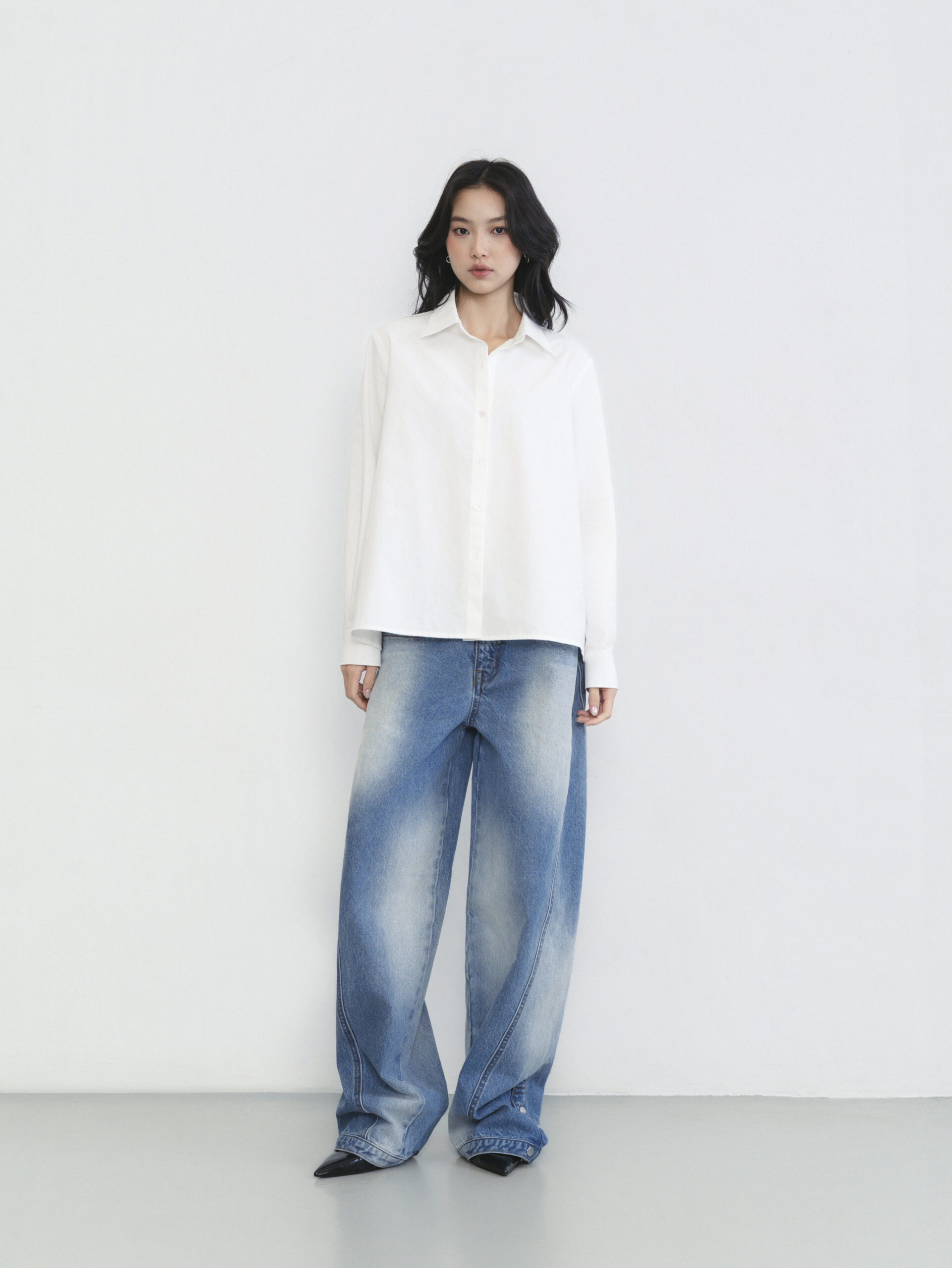 Áo sơ mi trắng thiết kế hai hàng khuy bên sườn, cho phép biến đổi linh hoạt giữa hai kiểu mặc: dáng cơ bản khi cài hàng khuy thẳng giữa, và dáng ôm eo khi cài chéo sang bên hông để tạo hiệu ứng vắt chéo tự nhiên.