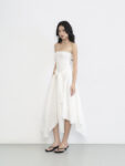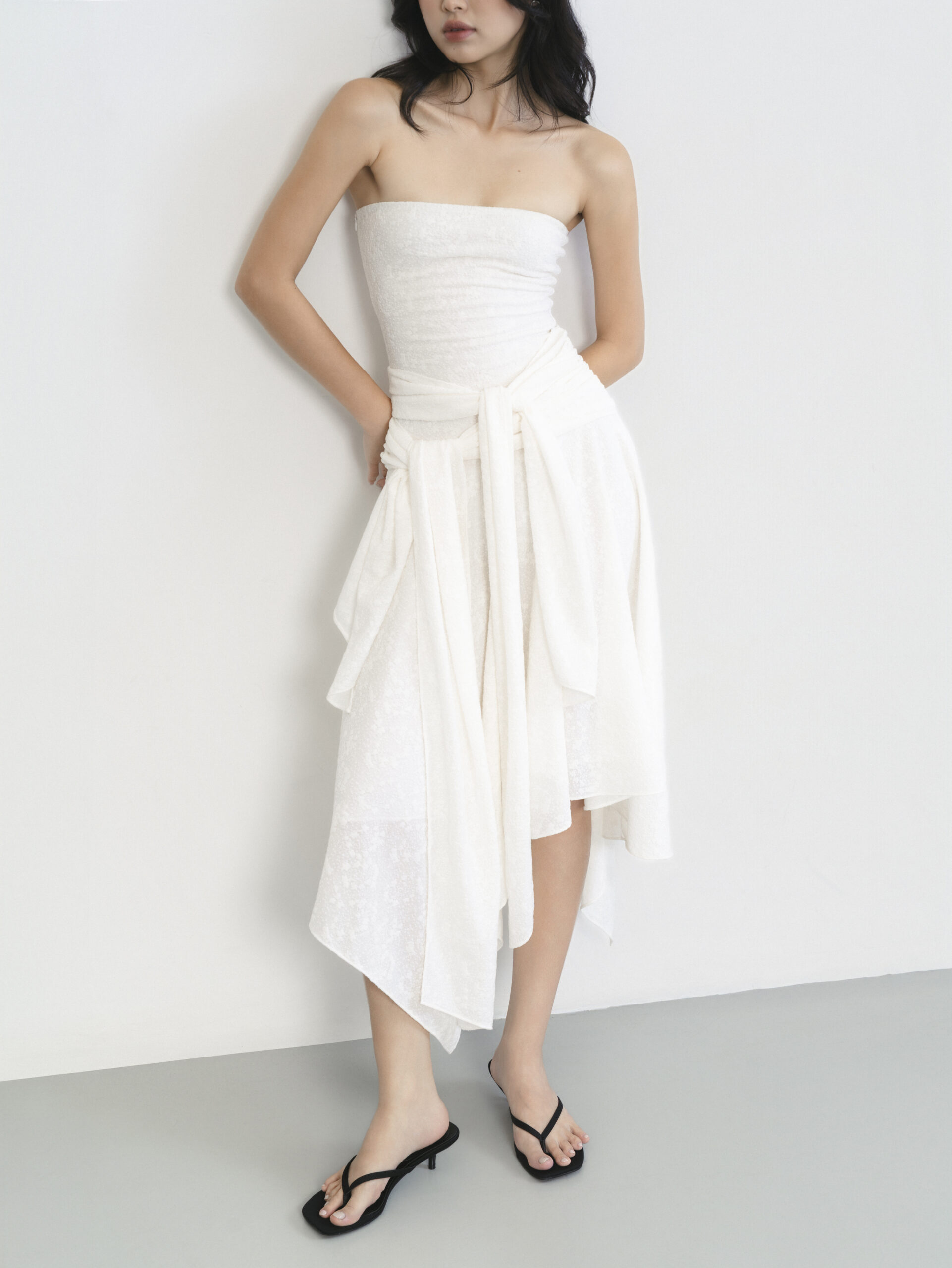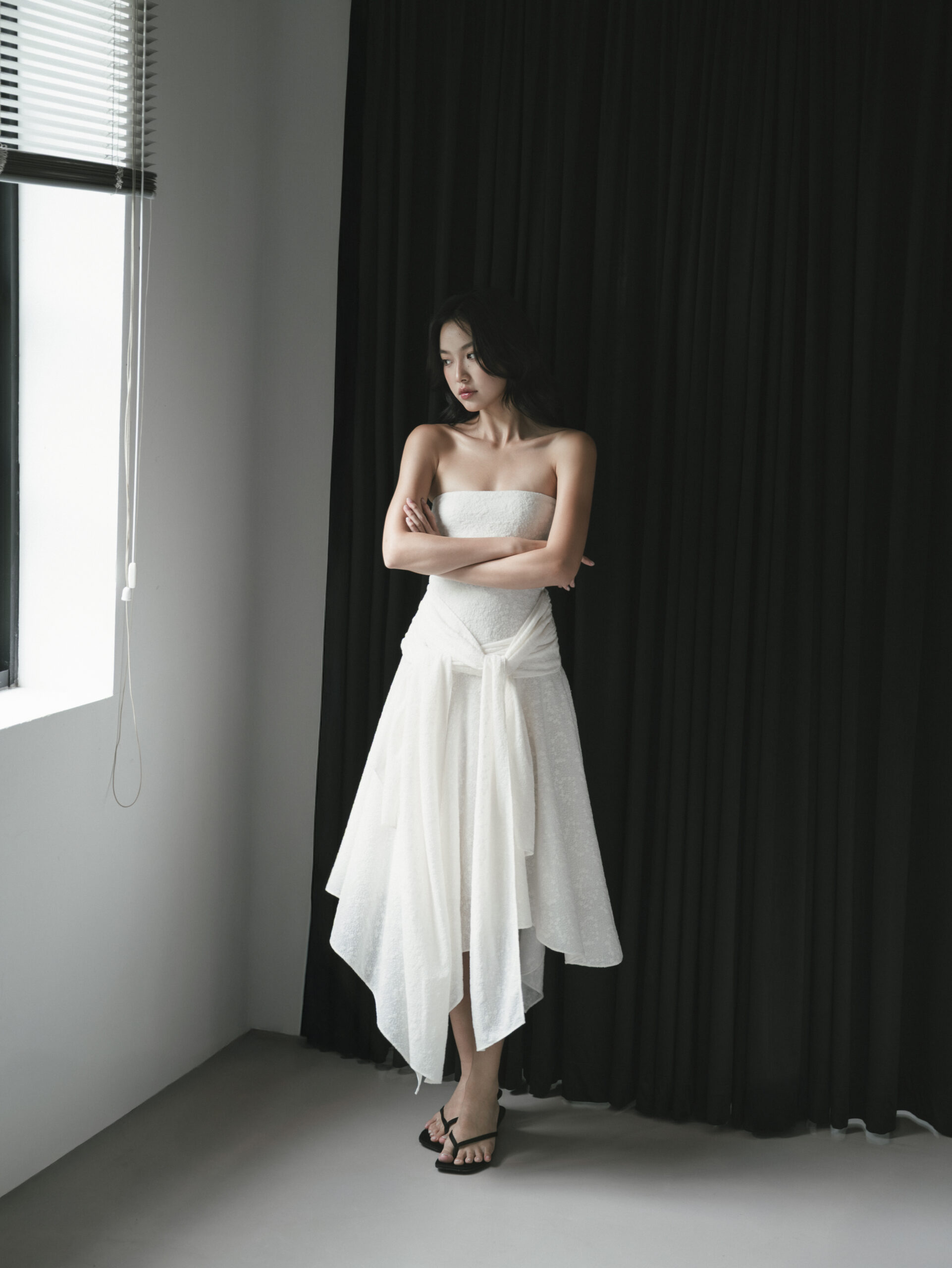 Đầm quây dáng bất đối xứng, được làm từ chất liệu vải rũ nhẹ, vải được dập nổi hoạ tiết hoa nhí, tạo độ rơi mềm mại đầy tính nữ. Phần thân trên ôm sát tôn dáng, nhấn eo bằng chi tiết draping và thắt nút lệch một bên, giúp tôn đường cong tự nhiên. Tà váy được xử lý cắt xếp tầng bất đối xứng, mang lại cảm giác bay bổng và chuyển động linh hoạt khi di chuyển.