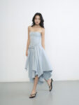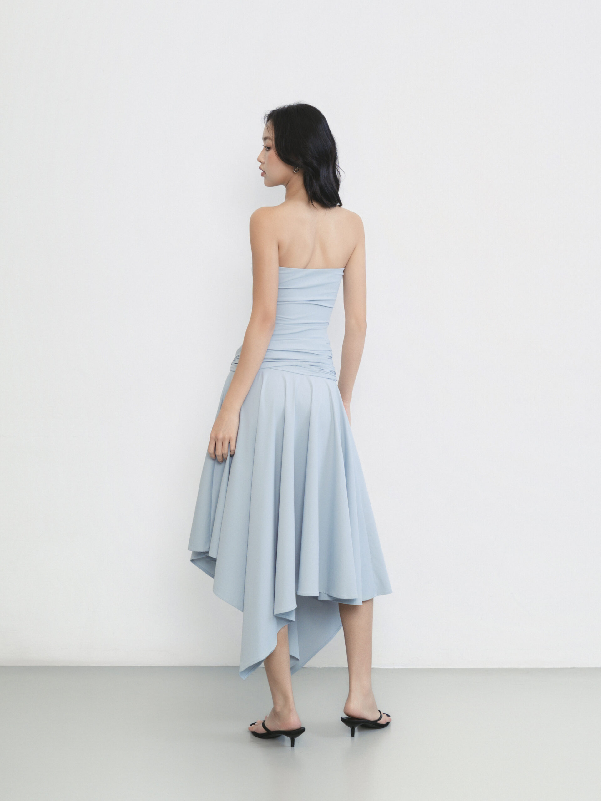 Tà váy được xử lý cắt xếp tầng bất đối xứng, mang lại cảm giác bay bổng và chuyển động linh hoạt khi di chuyển.