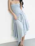 Đầm quây dáng bất đối xứng, được làm từ chất liệu vải rũ nhẹ, tạo độ rơi mềm mại. Phần thân trên ôm sát tôn dáng, nhấn eo bằng chi tiết draping và thắt nút lệch một bên, giúp tôn đường cong tự nhiên.