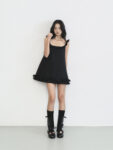 Thiết kế viền bèo quanh cổ và gấu váy tạo điểm nhấn mềm mại, trẻ trung. Phần lưng khoét sâu, nhấn bằng chi tiết dây mảnh buộc chéo tinh tế giúp giữ dáng và tăng vẻ nữ tính.