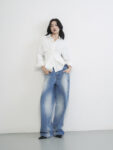 Áo sơ mi trắng thiết kế hai hàng khuy bên sườn, cho phép biến linh hoạt giữa hai mặc định kiểu:kiểu cơ sở khi cài hàng khuy thẳng giữa, và ôm eo khi cài chéo sang bên hông để tạo hiệu ứng chéo tự nhiên.