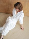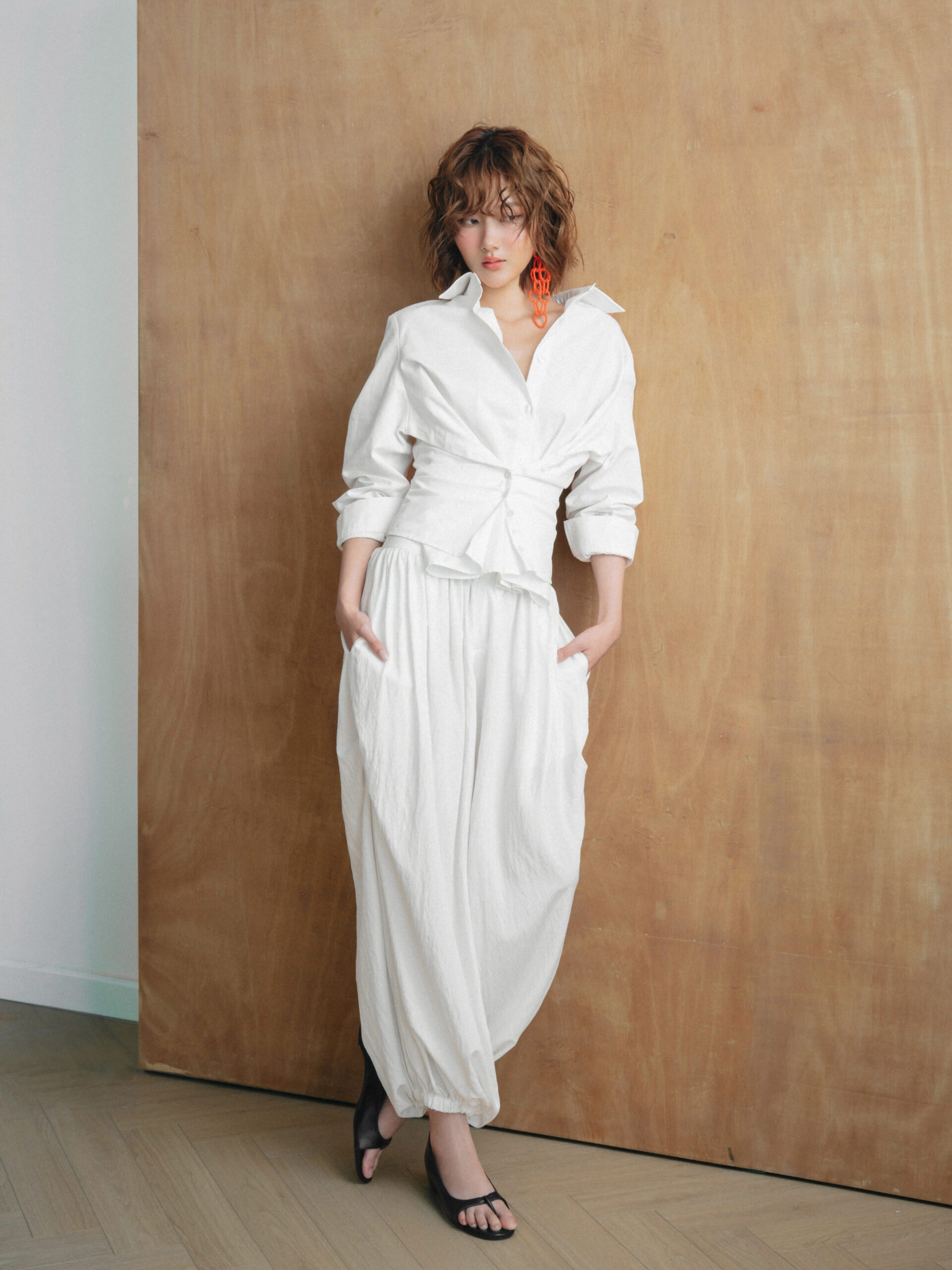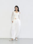 Quần dáng suông rộng, ống phồng nhẹ và được bo túm ở gấu, tạo hiệu ứng bay bổng và mềm mại khi di chuyển. Chất liệu vải mỏng nhẹ, hơi nhăn tự nhiên, có độ rũ và thoáng khí.