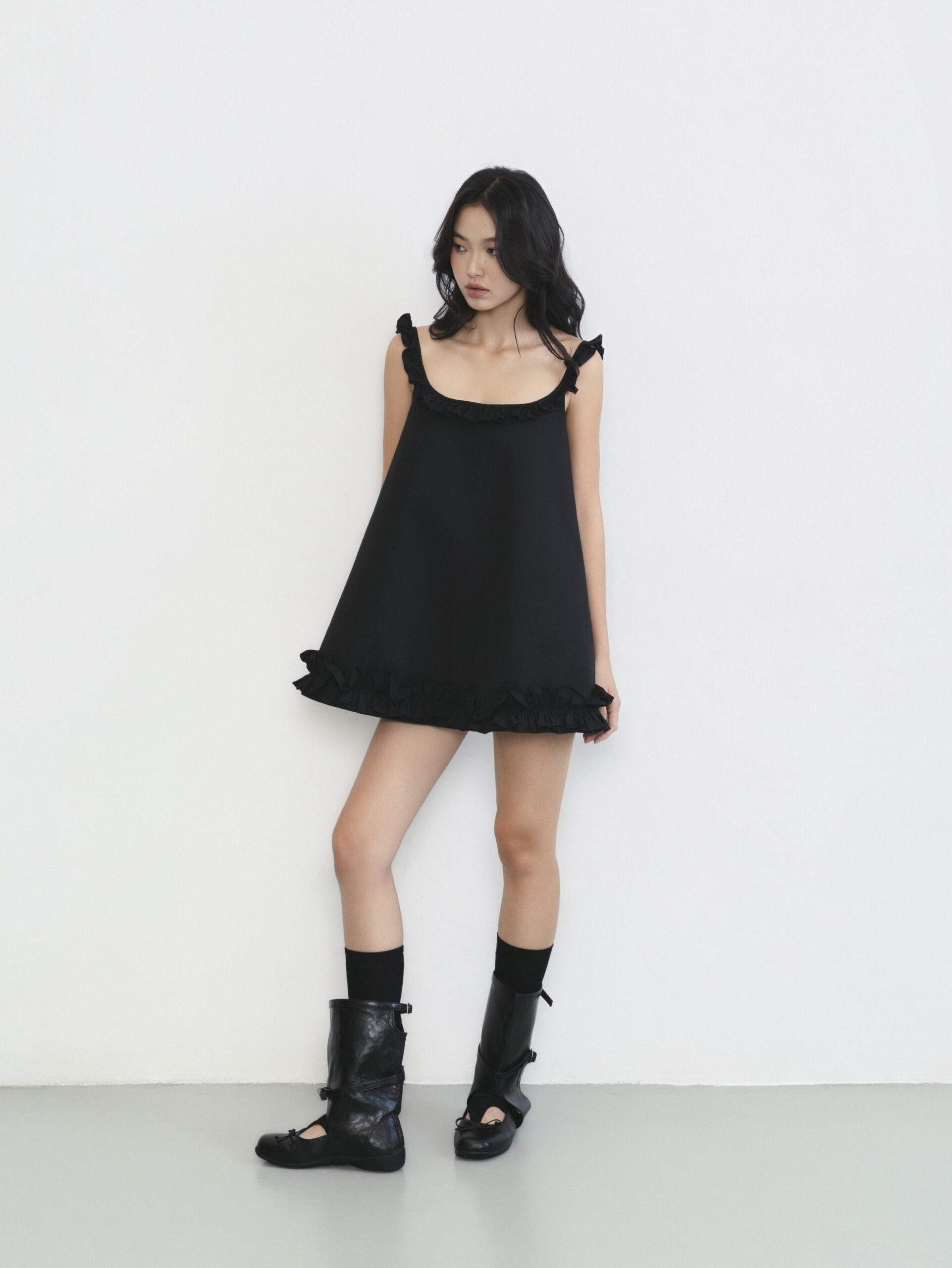 Đầm mini đen dáng A nhún bèo
